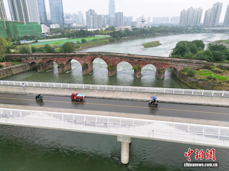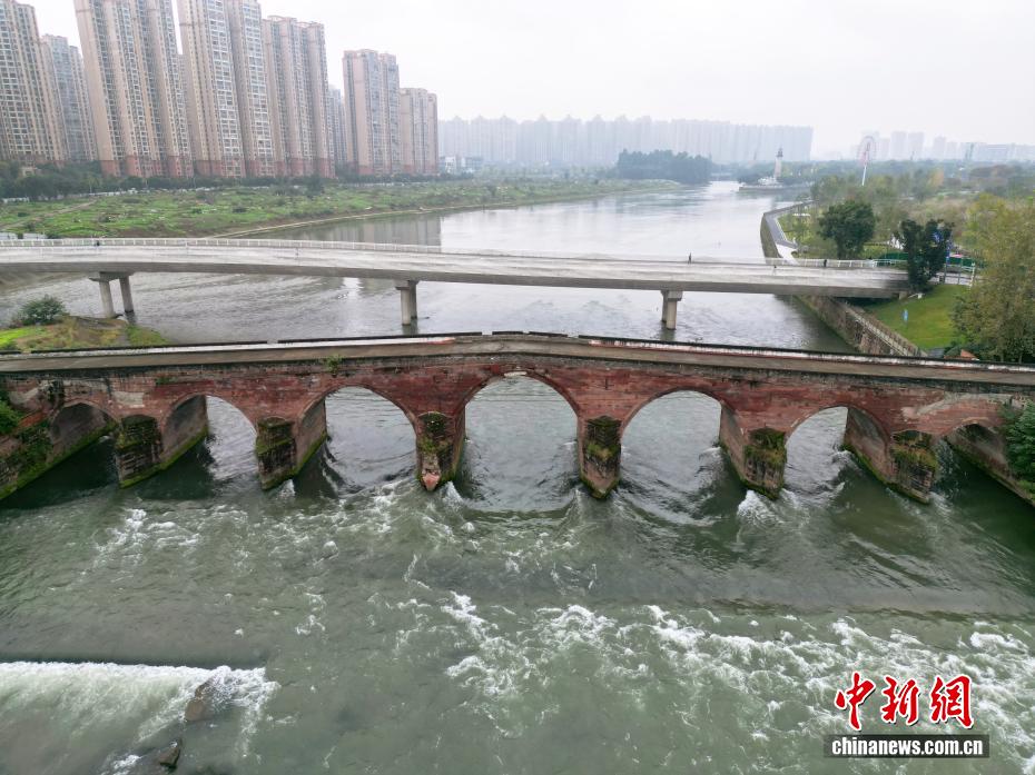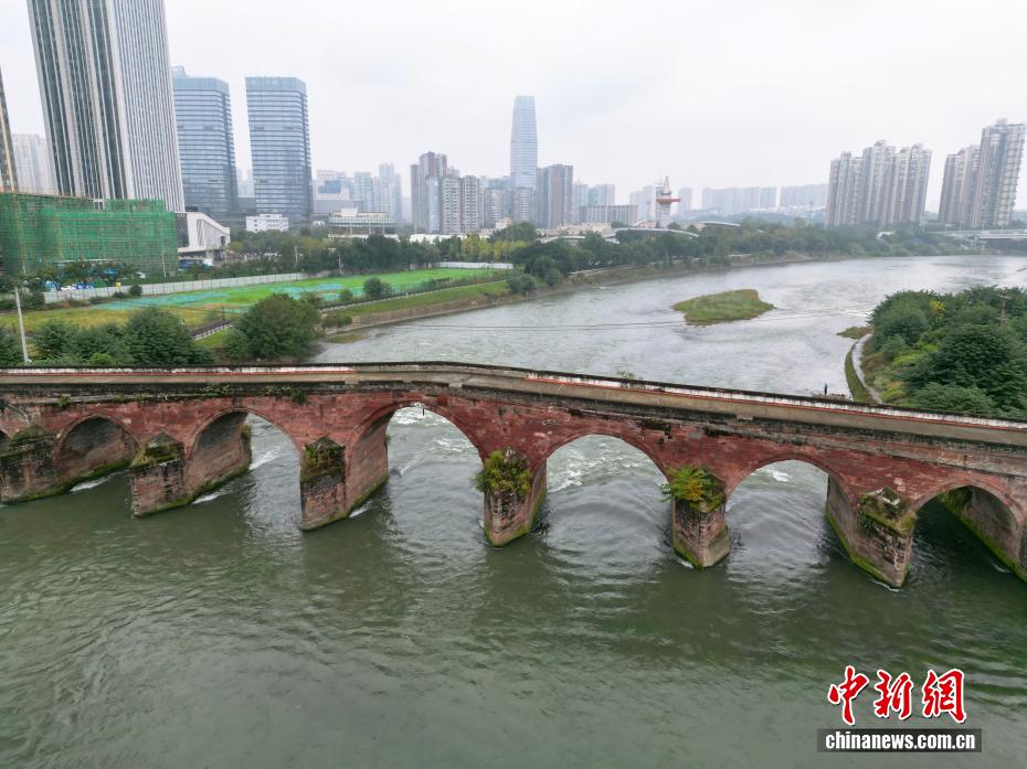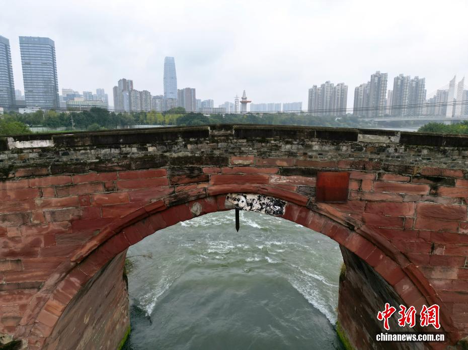 4 ноября, «Жэньминь жибао» онлайн -- На днях на снимке древнего моста храма Эрцзян в Чэнду провинции Сычуань виден железный меч, подвешенный под его центральной аркой над рекой Цзиньцзян, создавая картину «Древний мост с подвешенным мечом». Этот каменный арочный мост, построенный во времена династии Цин, имеет более чем 200-летнюю историю. Конструкция моста и древний меч до сих пор хорошо сохранились и входят в список ключевых объектов культурного наследия провинции Сычуань, охраняемых государством. (Фото с дрона)