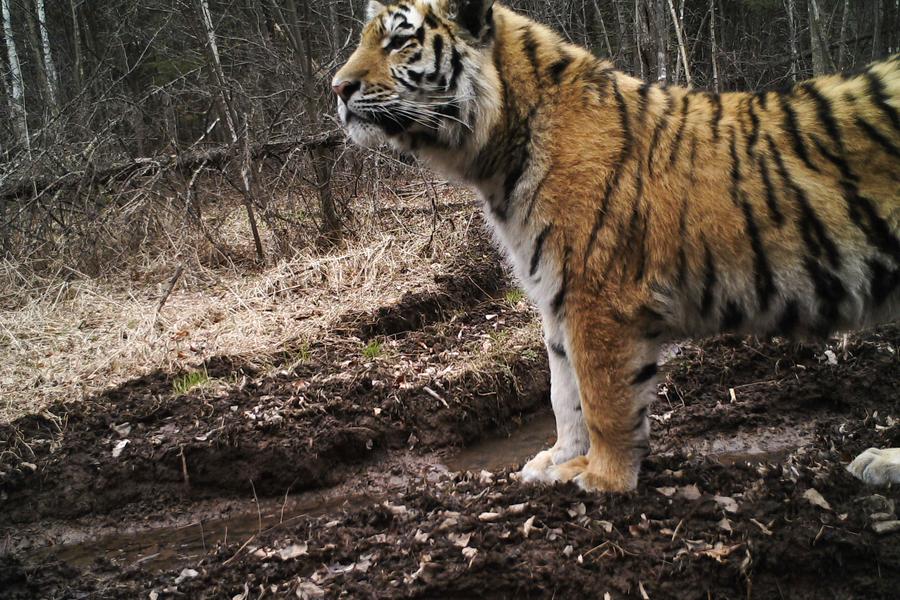 29 апреля 2023 года, на снимке, сделанном инфракрасной камерой, запечатлен маньчжурский /амурский/ тигр в Национальном парке маньчжурских тигров и дальневосточных леопардов Китая. /Фото: Синьхуа/