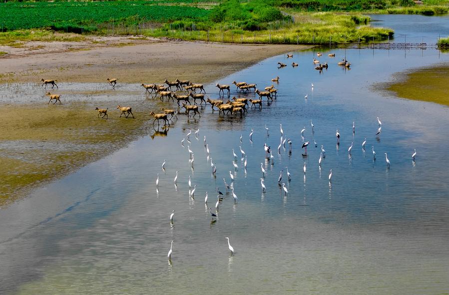 15 сентября 2025 года, перелетные птицы и олени Давида отдыхают на водно-болотных угодьях Тяоцзыни /пров. Цзянсу, Восточный Китай/. /Фото: Синьхуа/