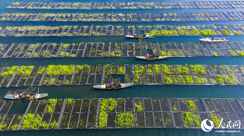 20 ноября, «Жэньминь жибао» онлайн -- На плавучих платформах площадью 1,4 га на озере Цяньдаоху в уезде Чуньань провинции Чжэцзян /Восточный Китай/ специалисты ухаживают за культурами и готовятся к посадке на зиму омежника яванского.