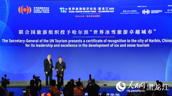 Официальная церемония вручения генеральным секретарем ООН Туризм сертификата о признании Харбина лидирующим и выдающимся в развитии ледово-снежного туризма состоялась 16 декабря на 11-м Всемирном туристическом экономическом форуме - Хэйлунцзян-2025 в Харбине.