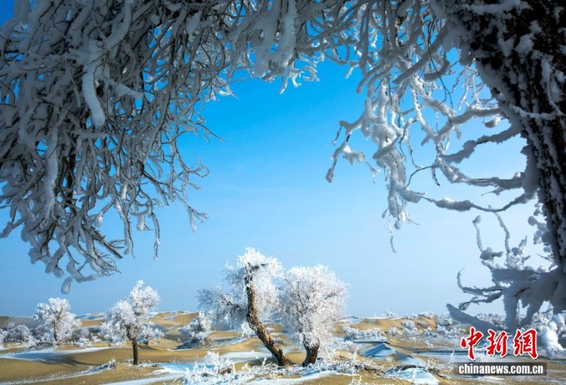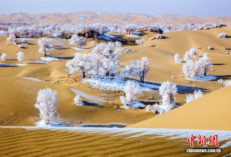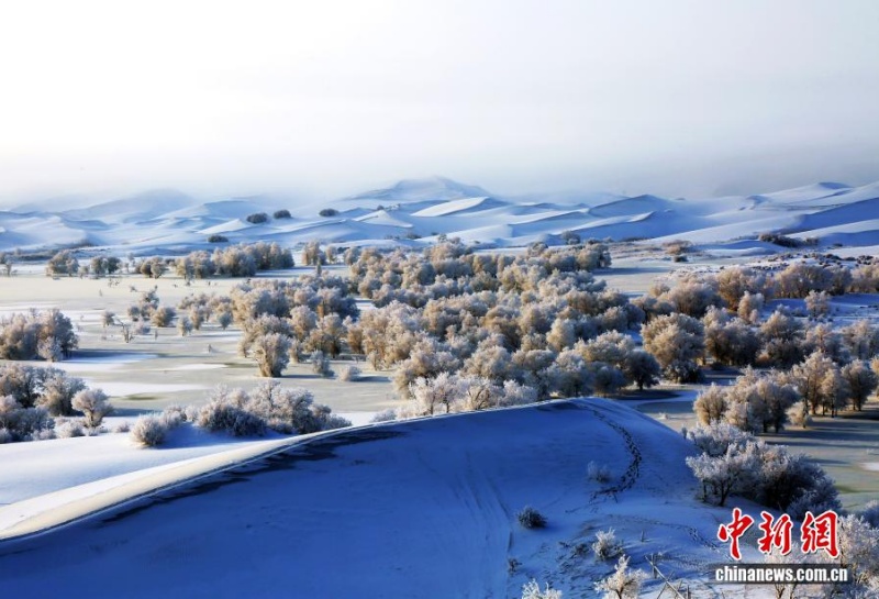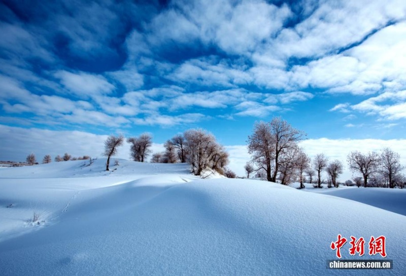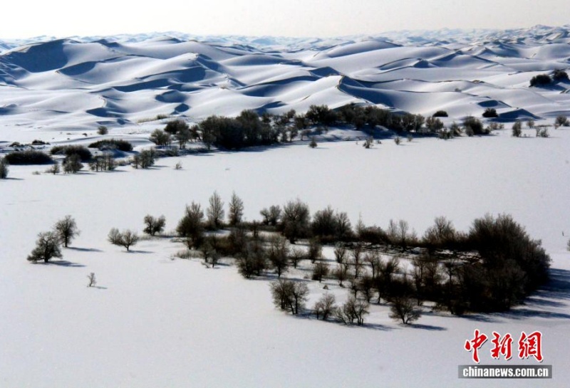 5 января, «Жэньминь жибао» онлайн -- 3 января пустыня Такла-Макан в Синьцзяне покрылась снегом. Холмистые дюны окутаны белым покровом, а тополя, разбросанные по песчаному морю, и извилистые русла рек блестят как жемчуг, создавая неповторимую картину.