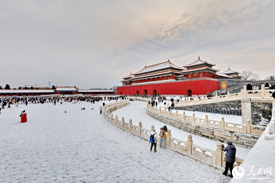 19 января, «Жэньминь жибао» онлайн -- 18 января Музей Гугун в Пекине, известный как Запретный город, после снегопада превратился в исторический свиток, окутанный белым покрывалом. Заснеженные здания предстали в новом, завораживающем виде, привлекая туристов, которые приезжают, чтобы полюбоваться этой красотой и запечатлеть ее на память.-0-