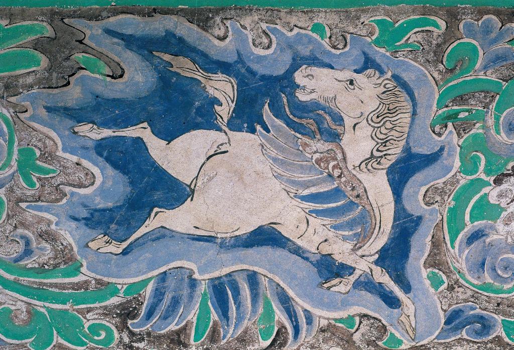 Пещеры Могао известны как «художественная галерея в пустыне». На настенных росписях, простирающихся на 45 тыс. кв м, можно увидеть изображения лошадей во время охоты, величественных церемониальных лошадей и небесных коней, парящих в облаках. Эти изображения отражают богатую и разнообразную жизнь и воображение древних людей, а также воссоздают социальный ландшафт древнего Шелкового пути.
