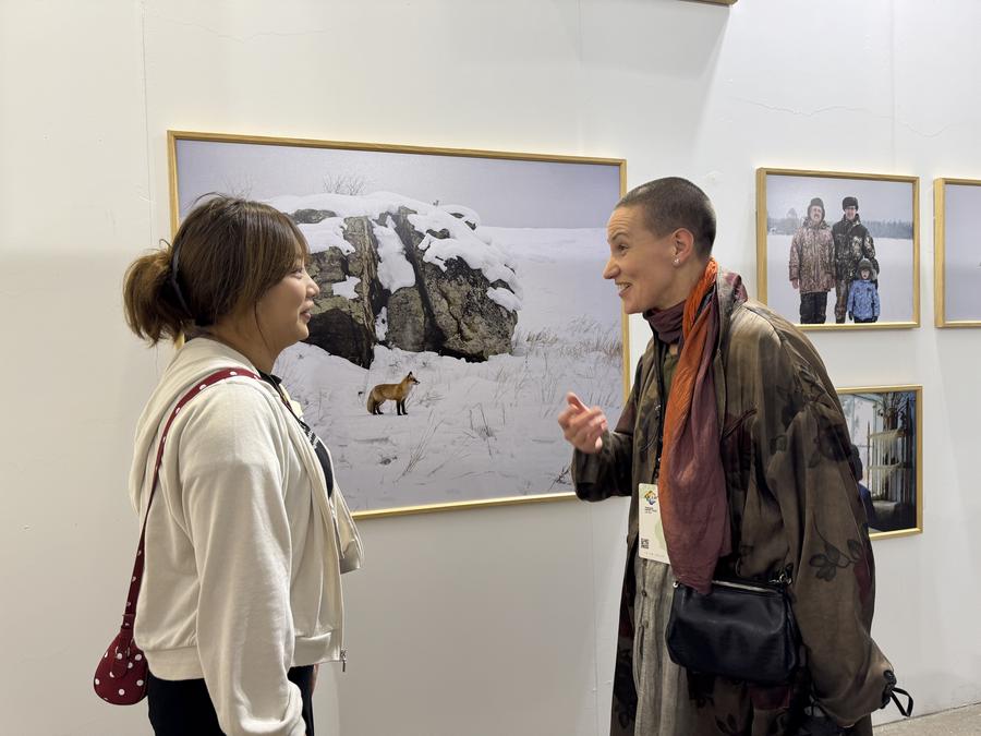 19 сентября 2025 года, Ирина Чмырева /справа/ рассказывает посетительнице о фотовыставке в ходе 25-го Пинъяоского международного фестиваля фотографии в одноименном городке провинции Шаньси /Северный Китай/. /Фото: Синьхуа/ |
