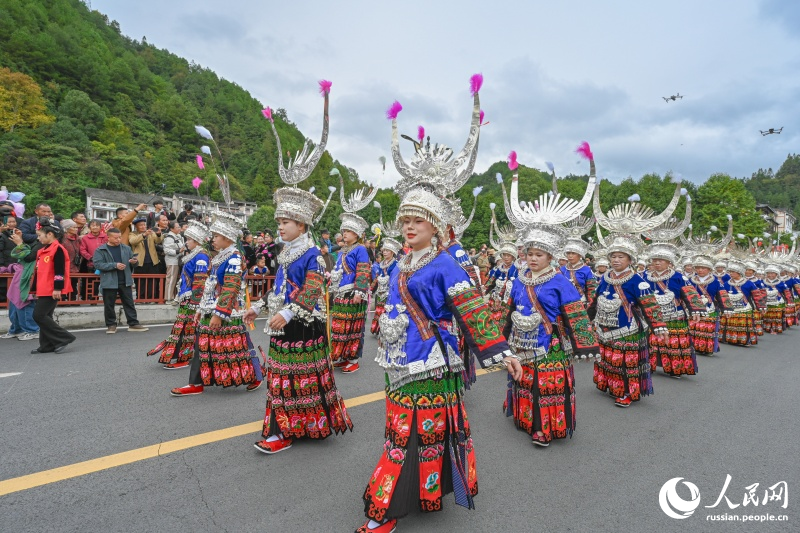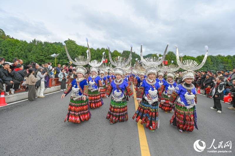 7 ноября, «Жэньминь жибао» онлайн -- 5 ноября в уезде Лэйшань в Цяньдуннань-Мяо-Дунском автономном округе провинции Гуйчжоу прошли мероприятия, посвященные Новому году народности мяо (мяо нянь). В тот день десятки тысяч жителей уезда приняли участие в масштабном танцевальном представлении Лушэн, банкете за длинным столом и параде нематериального культурного наследия.