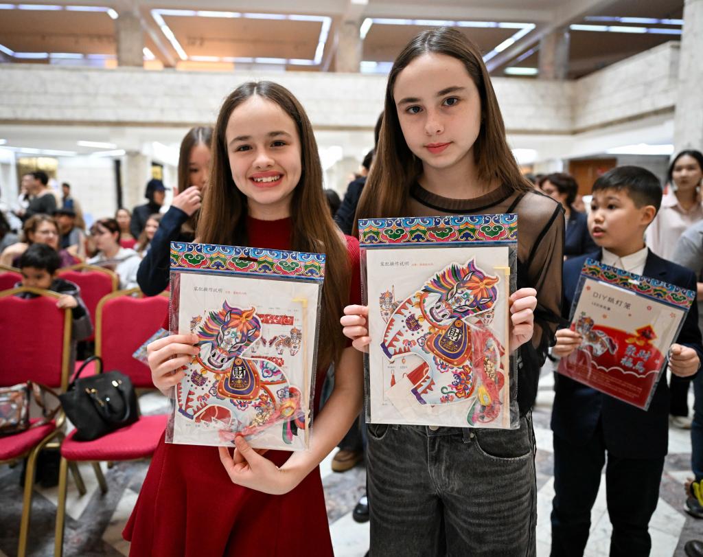 23 февраля, Алматы, Казахстан. Две девочки показывают сувениры, полученные ими на церемонии открытия выставки детского творчества в Национальном центральном музее Республики Казахстан. /Фото: Синьхуа/